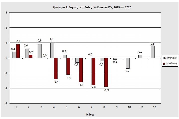 Σύμφωνα με τα στοιχεία της ΕΛΣΤΑΤ, ο Γενικός ΔΤΚ κατά τον μήνα Αύγουστο 2020, σε σύγκριση με τον Ιούλιο 2020, παρουσίασε μείωση 0,6% έναντι μείωσης 0,5% που σημειώθηκε κατά την αντίστοιχη σύγκριση του προηγούμενου έτους.