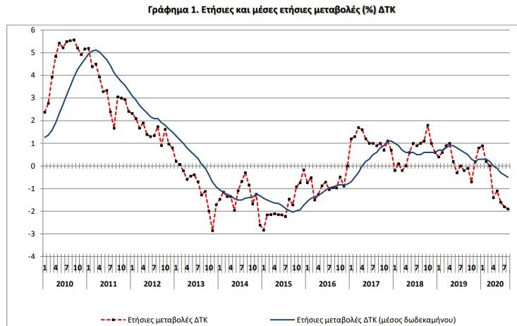 Ο μέσος ΕνΔΤΚ του δωδεκαμήνου Σεπτεμβρίου 2019 – Αυγούστου 2020, σε σύγκριση με τον αντίστοιχο Δείκτη του δωδεκαμήνου Σεπτεμβρίου 2018 – Αυγούστου 2019, παρουσίασε μείωση 0,4% έναντι αύξησης 0,8% που σημειώθηκε κατά την αντίστοιχη σύγκριση του δωδεκαμήνου Σεπτεμβρίου 2018 – Αυγούστου 2019 με το δωδεκάμηνο Σεπτεμβρίου 2017 – Αυγούστου 2018.
