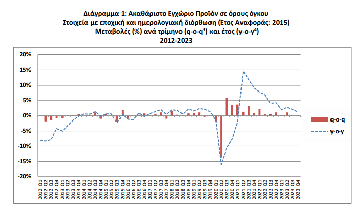 Συγκεκριμένα, με βάση τα διαθέσιμα εποχικά διορθωμένα στοιχεία, το Ακαθάριστο Εγχώριο Προϊόν (ΑΕΠ) σε όρους όγκου, κατά το 4ο τρίμηνο 2023 παρουσίασε αύξηση κατά 0,2%, σε σχέση με το 3ο τρίμηνο 2023, ενώ σε σύγκριση με το 4ο τρίμηνο 2022 παρουσίασε αύξηση κατά 1,2%.
