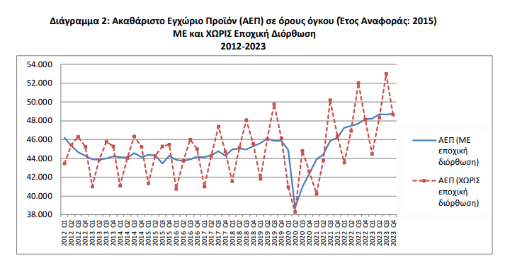 Το ΑΕΠ το 2023 σε όρους όγκου ανήλθε σε 194,5 δισ. ευρώ έναντι 190,7 δισ. ευρώ το 2022 παρουσιάζοντας αύξηση κατά 2%. Αυτή η αύξηση οφείλεται στις επιμέρους μεταβολές που καταγράφηκαν ανά συνιστώσα του ΑΕΠ.