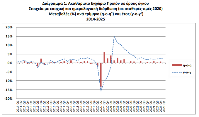 Με βάση τα μη εποχικά διορθωμένα στοιχεία το Ακαθάριστο Εγχώριο Προϊόν (ΑΕΠ) σε όρους όγκου, κατά το 1ο τρίμηνο 2025 παρουσίασε αύξηση κατά 1,8% σε σχέση με το 1ο τρίμηνο 2024.