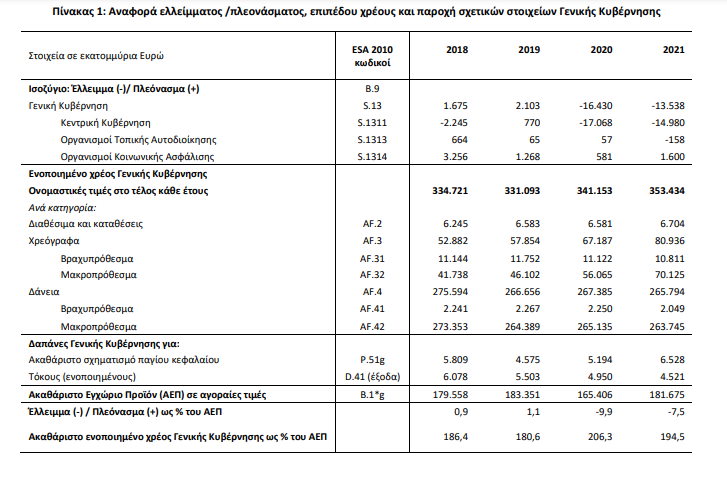 Το ακαθάριστο ενοποιημένο χρέος της Γενικής Κυβέρνησης σε ονομαστικές τιμές στο τέλος του 2021 υπολογίζεται στα 353 δισ. ευρώ (194,5% επί του Ακαθάριστου Εγχώριου Προϊόντος).