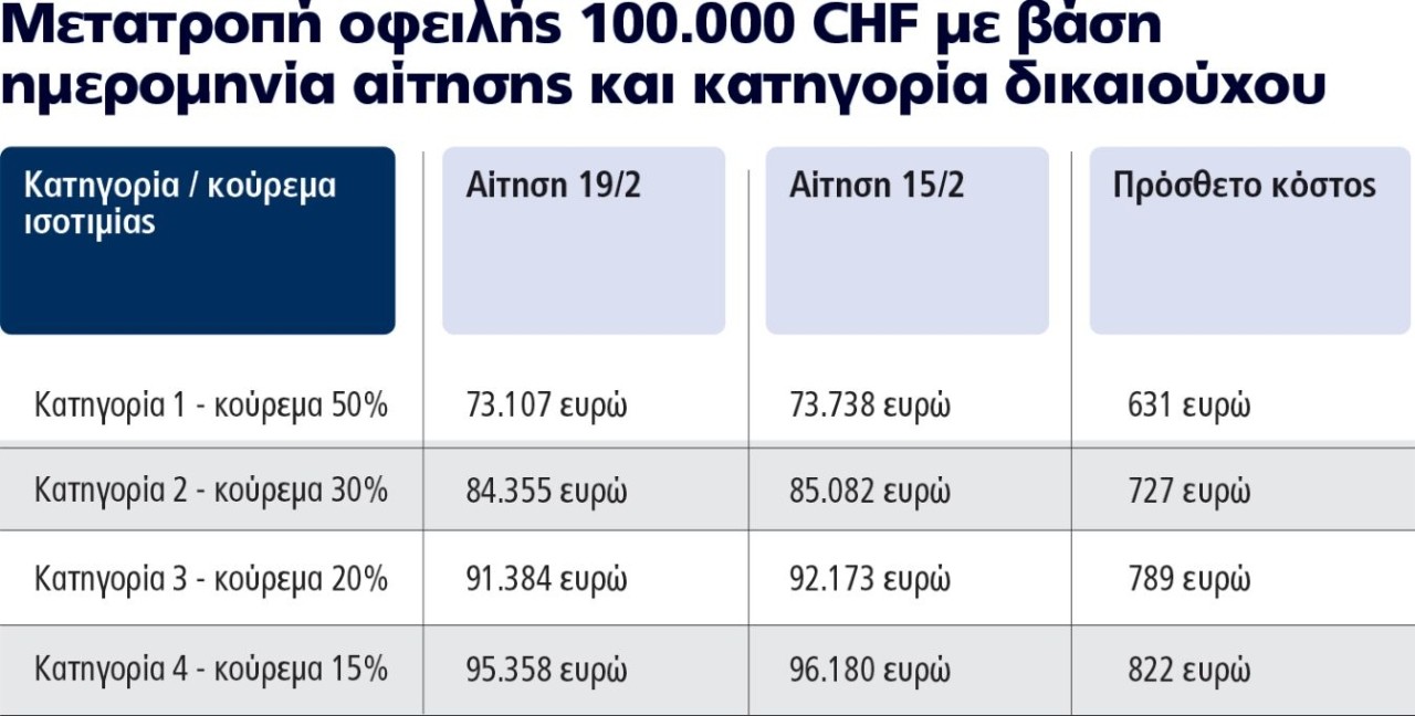 Ωστόσο η πλειονότητα των δανειοληπτών δεν έχει προχωρήσει ακόμα στη διαδικασία. Αν το έκαναν όμως σήμερα, στο παράδειγμα για οφειλή από δάνειο 100.000 CHF, η οφειλή μετά τη μετατροπή έχει επιβαρυνθεί ήδη έως και 832 ευρώ, ανάλογα με την οικονομική κατάσταση (κατηγορία) κάθε οφειλέτη, ως εξής: