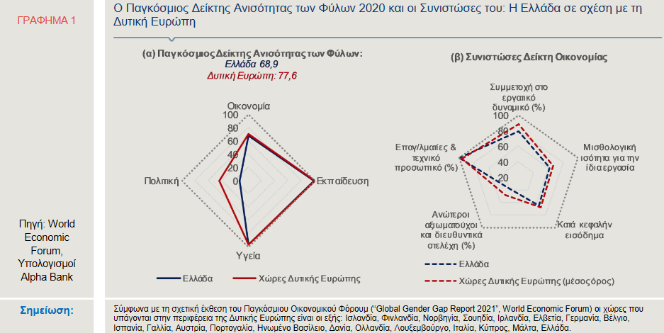 Ακόμη και μετά από δεκαετίες προόδου προς την κατεύθυνση της ισότητας των δύο φύλων, το χάσμα μεταξύ τους παραμένει σημαντικό, διαπιστώνει η Alpha Bank στο εβδομαδιαίο δελτίο οικονομικών εξελίξεων.