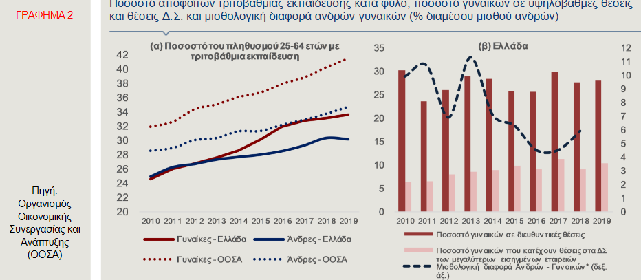Παρά το γεγονός ότι το ποσοστό του γυναικείου πληθυσμού, ηλικίας 25-64 ετών, με πανεπιστημιακή εκπαίδευση υπερβαίνει το αντίστοιχο ποσοστό των ανδρών (33,6%, έναντι 30,2%, Γράφημα 2α), εντούτοις, η αναλογία των γυναικών στα διευθυντικά στελέχη ήταν 28%, το 2019, ενώ οι γυναίκες-μέλη διοικητικών συμβουλίων των μεγαλύτερων εισηγμένων εταιριών στη χώρα, κατέλαβαν μόλις το 10,3%, κατά το ίδιο έτος (Γράφημα 2β). Σημειώνεται ότι οι αντίστοιχες αναλογίες των γυναικών στις χώρες του ΟΟΣΑ ήταν, το 2019, περίπου 1/3 στα διευθυντικά στελέχη και 1/4 στα μέλη Δ.Σ. των μεγαλύτερων εισηγμένων εταιριών.