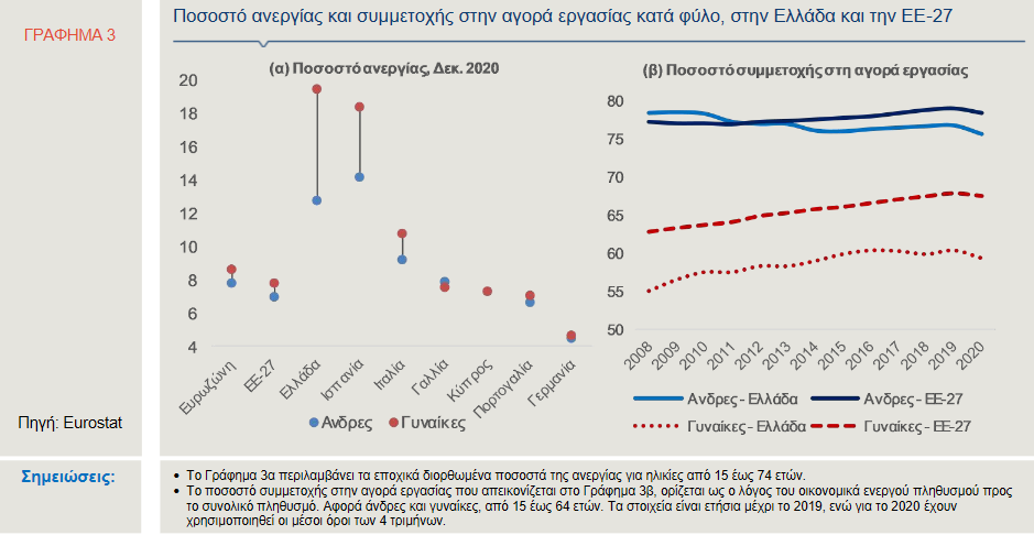 Επιπρόσθετα, σύμφωνα με την Τελική Έκθεση Πισσαρίδη (Νοέμβριος 2020), το ποσοστό συμμετοχής στην αγορά εργασίας, δηλαδή το εργατικό δυναμικό προς τον πληθυσμό, είναι συγκριτικά χαμηλό στην Ελλάδα (Eurostat, 2019: 68,4% έναντι 73,4% στην ΕΕ-27, για ηλικίες έως 64 ετών), γεγονός που οφείλεται πρωτίστως στη χαμηλή συμμετοχή των γυναικών. Όπως παρατηρείται στο Γράφημα 3β, ο λόγος των γυναικών που συμμετέχουν στο εργατικό δυναμικό, προς τον πληθυσμό των γυναικών, υπολείπεται σημαντικά τόσο του αντίστοιχου λόγου των ανδρών, όσο και του μέσου όρου της ΕΕ-27, αν και η τάση του, από το 2002, έως και το 2019, ήταν ανοδική. Το 2020, εκτιμάται -σύμφωνα με τα τριμηνιαία μη εποχικά διορθωμένα στοιχεία της Eurostat- ότι το ποσοστό συμμετοχής των γυναικών στην αγορά εργασίας, στην Ελλάδα, μειώθηκε εκ νέου, κατά μία ποσοστιαία μονάδα περίπου, σε 59,4%, ενώ και το ποσοστό των ανδρών σημείωσε αντίστοιχη πτώση (2019: 76,7%, 2020: 75,5%). Το τελευταίο ήταν απόρροια της πανδημίας που οδήγησε, μεταξύ άλλων, στη μείωση του οικονομικά ενεργού πληθυσμού στην Ελλάδα κατά 2,3%, σε ετήσια βάση, καθώς, λόγω των μέτρων περιορισμού της οικονομικής δραστηριότητας και των υγειονομικών συνθηκών, αρκετά άτομα που αναζητούσαν εργασία δήλωσαν ότι δεν είναι άμεσα διαθέσιμα να εργαστούν. Αξίζει να σημειωθεί ότι ο ετήσιος ρυθμός μείωσης των οικονομικά ενεργών γυναικών υπερέβη, το 2020, τον αντίστοιχο των ανδρών (-2,4%, έναντι -2,2%).