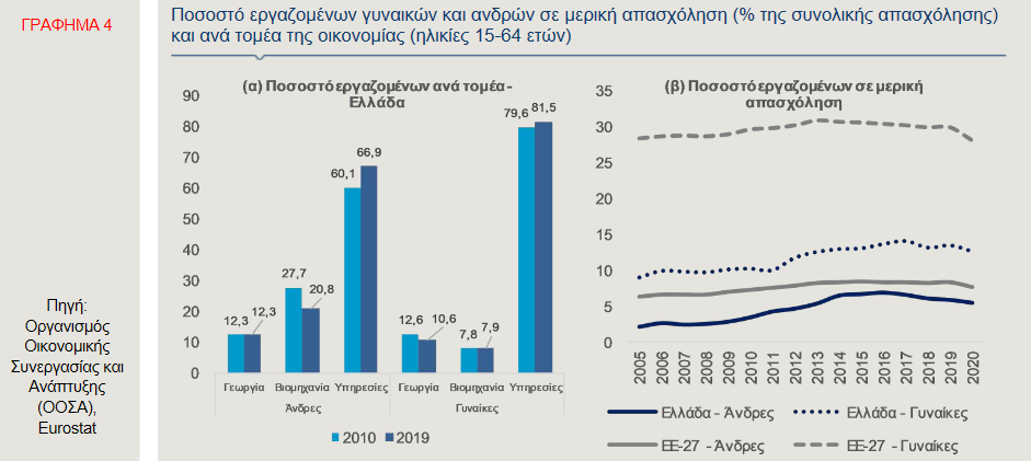 Παράλληλα, το ποσοστό των γυναικών που εργάζεται υπό καθεστώς μερικής απασχόλησης (ως ποσοστό της συνολικής απασχόλησης) είναι υπερδιπλάσιο του αντίστοιχου των ανδρών (13,5%, έναντι 5,9% το 2019, Γράφημα 4β). Το υψηλό ποσοστό της μερικής απασχόλησης, αφενός μεν αποτελεί κληροδότημα της οικονομικής κρίσης της προηγούμενης δεκαετίας, αφετέρου δε, αντανακλά τον περισσότερο χρόνο που είθισται να αφιερώνουν οι γυναίκες στη φροντίδα των παιδιών ή των ηλικιωμένων μελών της οικογένειας. Το 2020, ωστόσο, υποχώρησε ο αριθμός τόσο των ανδρών, όσο και των γυναικών που εργάζονται με μερική απασχόληση.