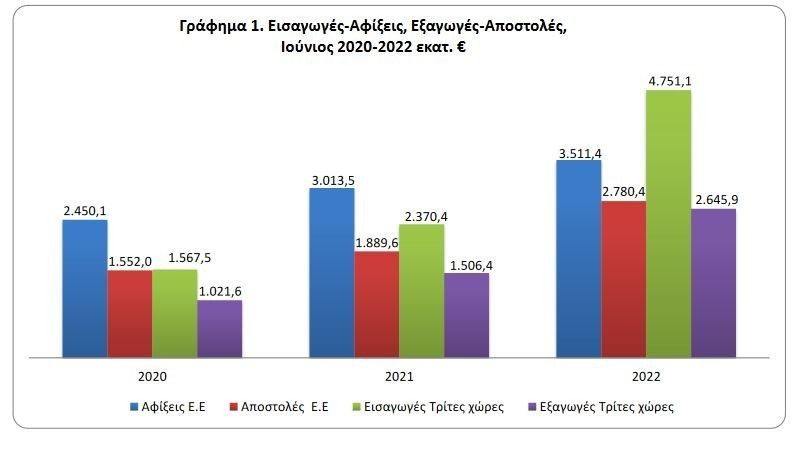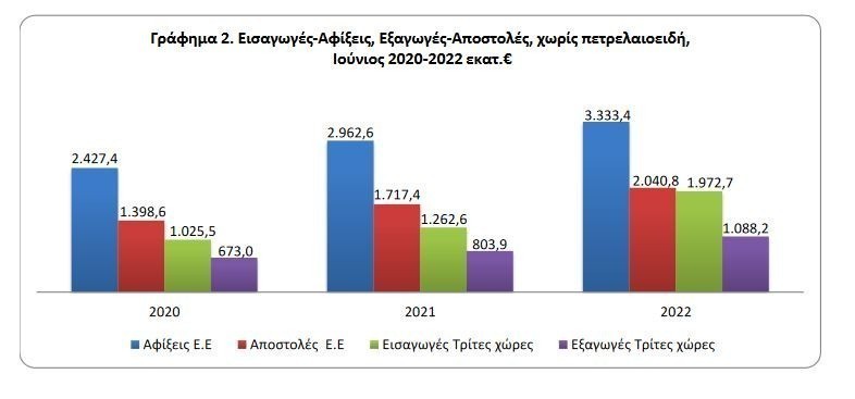 Κατά 42,7% αυξήθηκε το εμπορικό έλλειμμα της χώρας τον Ιούνιο του 2022, δεδομένου ότι η αξία των εισαγωγών αυξήθηκε κατά 53,5% και υπερκέρασε σε απόλυτα μεγέθη την ποσοστιαία αύξηση της αξίας των εξαγωγών (59,8%).