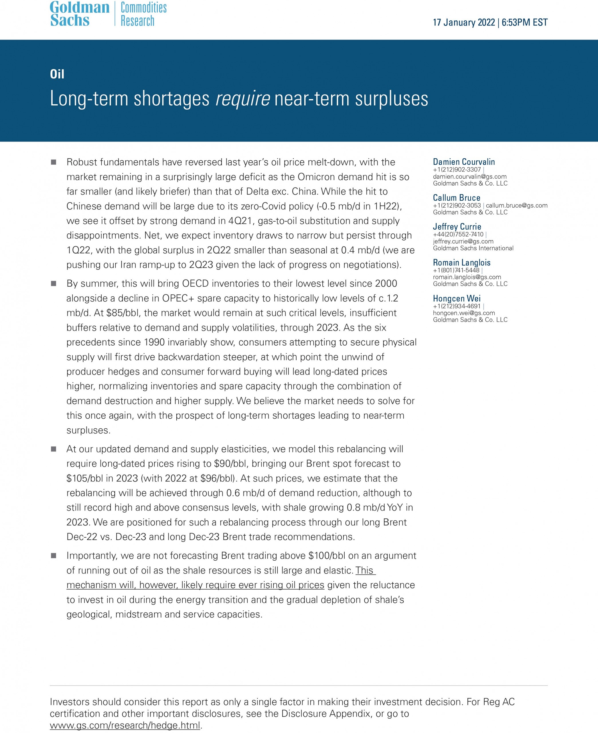 Από την πλευρά της η Goldman Sachs, μία από τις κορυφαίες επενδυτικές τράπεζες στον κόσμο, βλέπει τις τιμές του brent να ανεβαίνουν λόγω rebalancing μεταξύ προσφοράς και ζήτησης στα 90 δολ./βαρέλι και να αγγίζουν τα 100 δολάρια το τρίτο τρίμηνο του 2022 λόγω του μεγάλου ελλείμματος αποθεμάτων και να φθάνουν ακόμη και τα 105 δολ./βαρέλι το 2023. Συνολικά, η Goldman Sachs ισχυρίζεται πως η αποκλιμάκωση των τιμών του πετρελαίου θα απαιτήσει χρόνο και δεν θα πραγματοποιηθεί νωρίτερα του 2023.