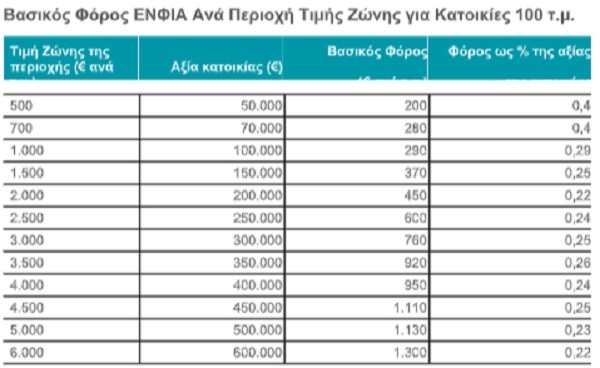 Όπως αποδεικνύεται σε μελέτη της «Διανέοσις», το ύψος του βασικού φόρου (€ ανά τ.μ.) βαίνει αυξανόμενο όσο αυξάνουν οι τιμές ζώνης, αυτό όμως δεν εξασφαλίζει την προοδευτικότητα του φόρου σε σχέση με την αξία των ακινήτων!
