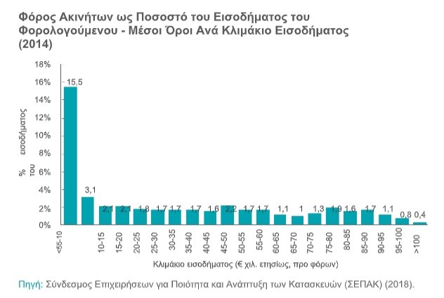 Έτσι, η επιβάρυνση από τον ΕΝΦΙΑ των φορολογούμενων με εισόδημα μέχρι €5.000 είναι υπερπενταπλάσια της φορολογικής επιβάρυνσης των φορολογούμενων με εισόδημα €5.001–10.000, σχεδόν οκταπλάσια αυτής των φορολογούμενων με ετήσιο εισόδημα €10.001-60.000 και 39 φορές μεγαλύτερη αυτών που έχουν εισόδημα πάνω από €100.000.