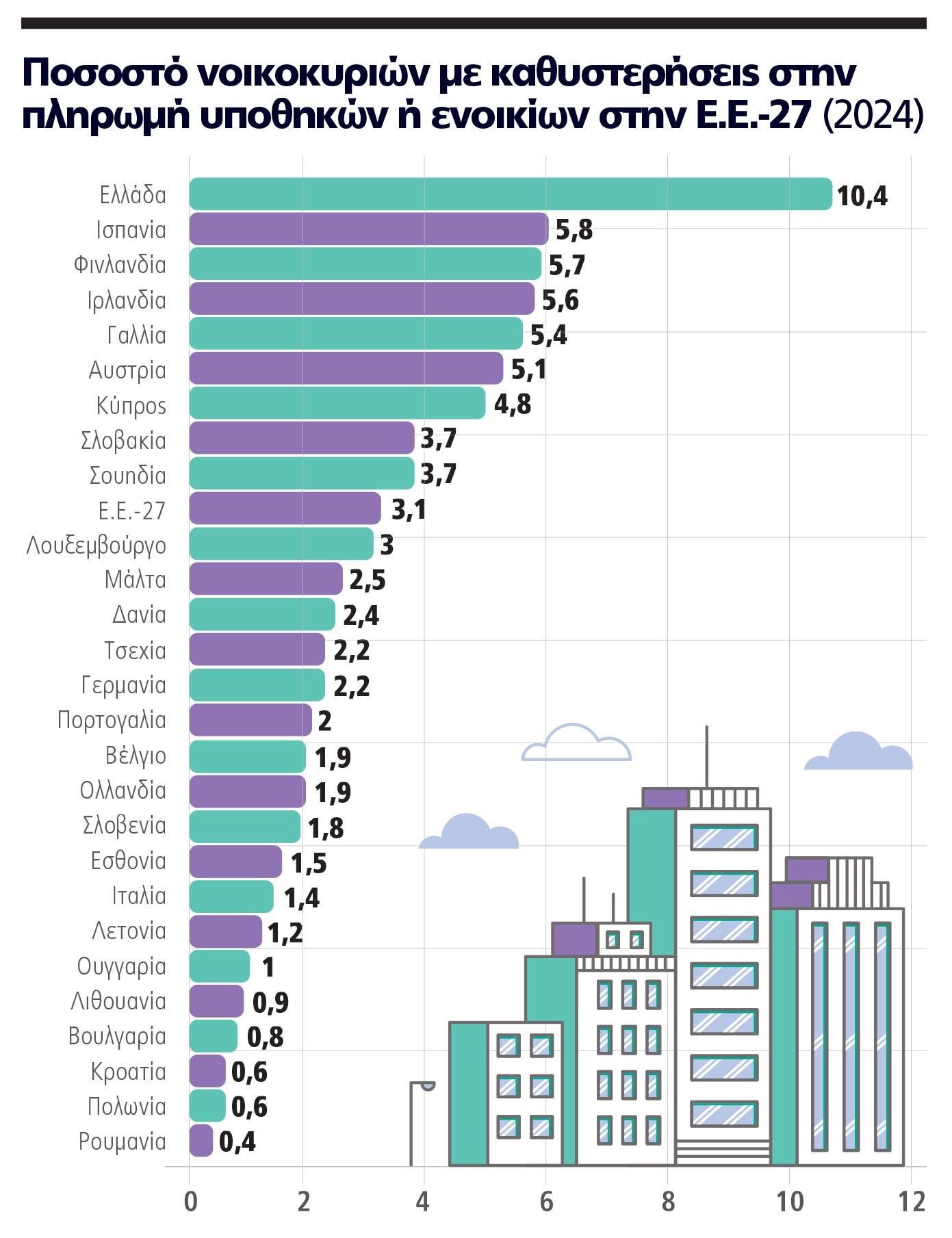 Την τάση αδυναμίας πληρωμών των συμφωνηθέντων ποσών αποτυπώνουν τα στοιχεία της Eurostat, τα οποία επικαλείται η νέα έρευνα της διαΝΕΟσις για τη στέγαση και δείχνουν ότι η Ελλάδα είναι «πρωταθλήτρια Ευρώπης» στις καθυστερήσεις ενοικίων και δόσεων στεγαστικών δανείων: 1 στα 10 δεν πληρώνει στην ώρα του, ποσοστό εντυπωσιακά υψηλό, όταν στην Ισπανία, αντιστοίχως, είναι 1 στα 20, ενώ στην Ε.Ε. συνολικά μόλις 1 στα 30 κατά μέσο όρο.
