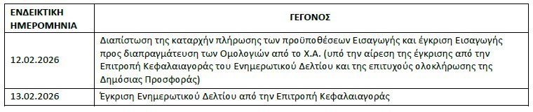 Το Χ.Α., κατά τη συνεδρίαση της 12.02.2026, ενέκρινε την εισαγωγή των Ομολογιών στην Κατηγορία Τίτλων Σταθερού Εισοδήματος της Ρυθμιζόμενης Αγοράς του Χ.Α. (η «Εισαγωγή»), υπό την αίρεση της έγκρισης του Ενημερωτικού Δελτίου από την Επιτροπή Κεφαλαιαγοράς και της επιτυχούς ολοκλήρωσης της Δημόσιας Προσφοράς.