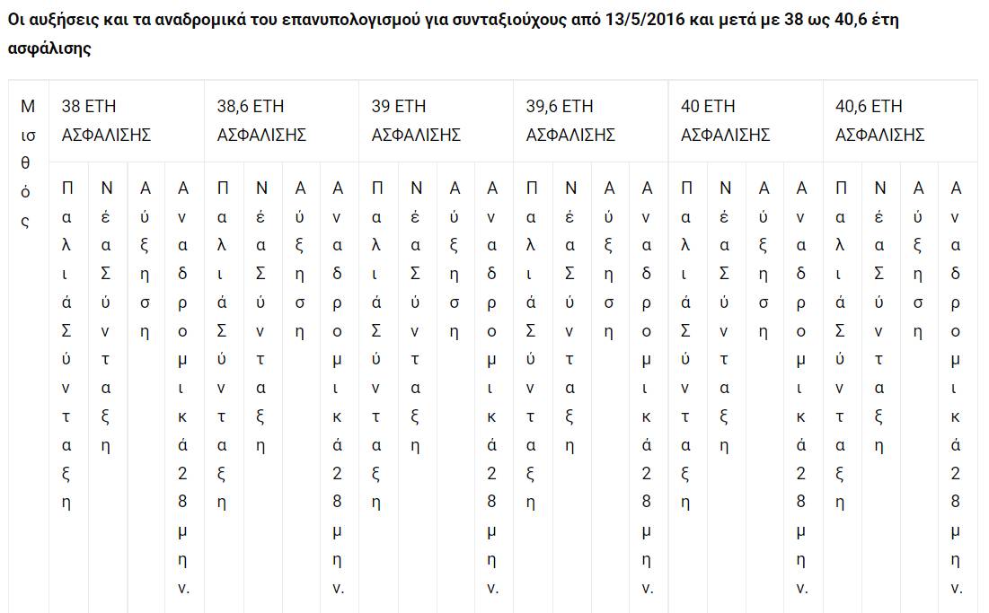 Σύμφωνα με δημοσίευμα του Ελεύθερου Τύπου, για τους επανυπολογισμούς συντάξεων με αποχώρηση μετά τον Μάιο του 2016 και μέχρι 30/9/2019, τα ποσά αυξήσεων και αναδρομικών (μεικτά) που θα λάβουν οι συνταξιούχοι, ανάλογα με τα έτη ασφάλισης και τον μέσο μισθό που είχαν πριν βγουν στη σύνταξη, διαμορφώνονται ως εξής: