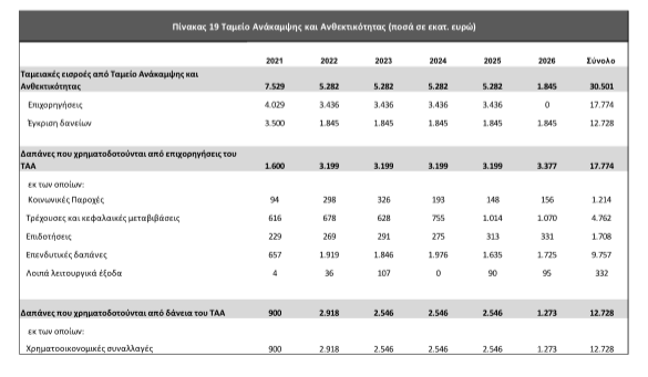 Στον παραπάνω Πίνακα 19 παρουσιάζονται οι αναμενόμενες έως το 2026 ετήσιες ταμειακές εισροές από το Ταμείο Ανάκαμψης και Ανθεκτικότητας που αφορούν τόσο τις επιχορηγήσεις όσο και τα εγκεκριμένα δάνεια. Παρουσιάζονται επίσης οι εκτιμώμενες ετήσιες δαπάνες που θα χρηματοδοτηθούν από τις επιχορηγήσεις, εκ των οποίωνσχεδόν 9,8 δισ. ευρώ αναμένεται να κατανεμηθούν προς τις δημόσιες επενδύσεις, 4,8 δισ. ευρώ προς μεταβιβάσεις, 1,7 δισ. ευρώ προς επιδοτήσεις, 1,2 δισ. ευρώ σε δαπάνες κοινωνικού χαρακτήρα και το 0,3 δισ. ευρώ στην ενδιάμεση κατανάλωση.