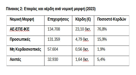 Οι ανώνυμες, ΕΠΕ και ΙΚΕ (134.708 επιχειρήσεις) συγκέντρωσαν το 76,8% των κερδών, ενώ οι προσωπικές εταιρείες (ΟΕ, ΕΕ κ.λπ.) με 131.359 επιχειρήσεις περιορίστηκαν στο 15,9% των κερδών.