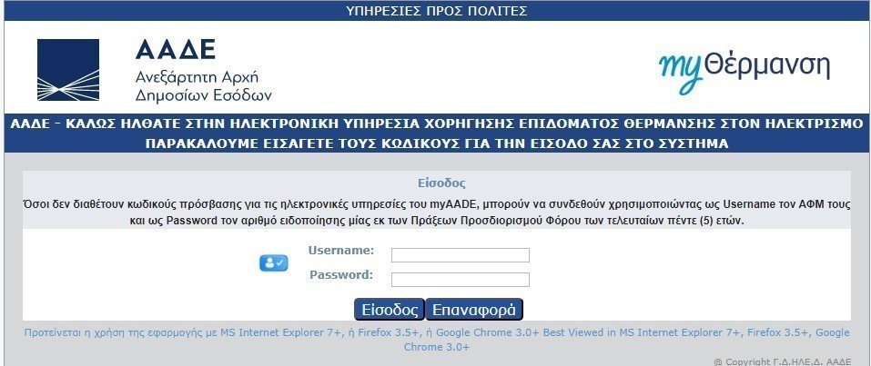 Συγκεκριμένα οι ενδιαφερόμενοι υποβάλλουν την αίτηση στο «myΘέρμανση» της ΑΑΔΕ. Κάθε νοικοκυριό μπορεί να υποβάλει μία αίτηση, καταχωρώντας τον αριθμό παροχής της κύριας κατοικίας του.