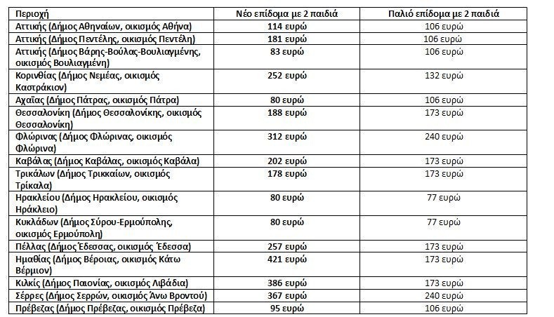 Το υπουργείο Οικονομικών παραθέτει πίνακα με το ύψος του επιδόματος που αντιστοιχεί σε νοικοκυριά που κατοικούν σε διάφορες περιοχές της χώρας ανάλογα με τον αριθμό των παιδιών τους.
