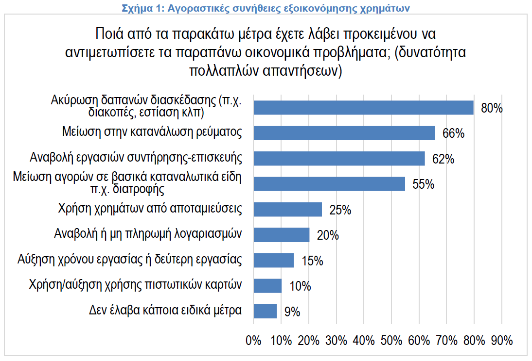 Ξεκάθαρη είναι, σύμφωνα με την έρευνα, μία τάση των καταναλωτών για εξοικονόμηση χρημάτων όσον αφορά τις αγορές βασικών αγαθών και υπηρεσιών και δευτερευόντως διαχείρισης χρημάτων.