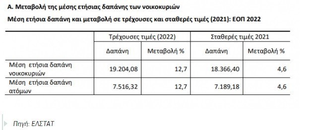 Σε σταθερές τιμές, η μέση ετήσια δαπάνη των νοικοκυριών αυξήθηκε σε ποσοστό 4,6% ή 837,68 ευρώ, λόγω της επίδρασης του πληθωρισμού, σύμφωνα με τον Δείκτη Τιμών Καταναλωτή έτους 2022 που ήταν 7,2%. Ωστόσο, η μέση ετήσια δαπάνη το 2022 ήταν μειωμένη κατά 24,5% σε σχέση με το 2008 και κατά 18,2% σε σύγκριση με το 2010.