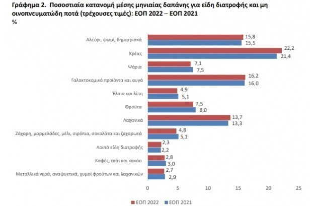 Όσον αφορά στις δαπάνες για είδη διατροφής και μη οινοπνευματώδη ποτά, σε σχέση με την προηγούμενη έρευνα (2021), παρατηρείται αύξηση της μέσης μηνιαίας δαπάνης (τρέχουσες τιμές), στα παρακάτω είδη: