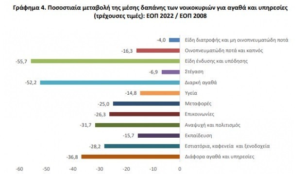 Στο παρακάτω γράφημα παρουσιάζεται η ποσοστιαία μεταβολή των μηνιαίων δαπανών των νοικοκυριών για αγαθά και υπηρεσίες, σε τρέχουσες τιμές, σύμφωνα με τα στοιχεία των ερευνών ΕΟΠ 2008 και 2022. Μείωση καταγράφεται σε όλες τις κατηγορίες, με την μεγαλύτερη να παρατηρείται στη δαπάνη για είδη ένδυσης και υπόδησης (-55,7%) και την μικρότερη στα είδη διατροφής και μη οινοπνευματώδη ποτά (-4,0%).
