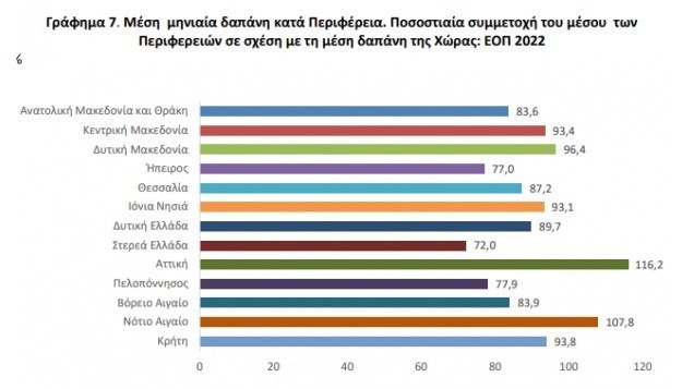 Τα νοικοκυριά που διαμένουν στην Περιφέρεια Αττικής δαπανούν, κατά μέσο όρο, το 116,2% της μέσης μηνιαίας δαπάνης των νοικοκυριών της Χώρας, ενώ αυτά που διαμένουν στην Περιφέρεια Στερεάς Ελλάδος το 72,0% αυτής.