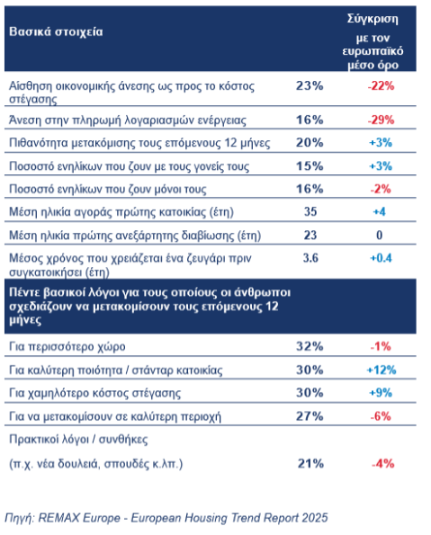 Ωστόσο, περίπου ένας στους τρεις Έλληνες (27%) δυσκολεύεται να ανταποκριθεί στο κόστος της τωρινής του κατοικίας, έναντι 17% στο σύνολο των Ευρωπαίων, ενώ ακόμα περισσότεροι Έλληνες (34%) αντιμετωπίζουν δυσκολίες για τους λογαριασμούς ενέργειας (στην Ευρώπη το ποσοστό είναι 16%). Επίσης, περίπου ένας στους δέκα (11%) ξοδεύει πάνω από το 50% του εισοδήματός του σε στέγαση και λογαριασμούς, κάτι που επηρεάζει αρνητικά τα επίπεδα στεγαστικής ικανοποίησης.