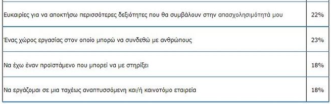 - το 35% των Ελλήνων ερωτηθέντων δήλωσε ότι προήχθη αλλά μόνο το 12% δηλώνει ότι έλαβε αύξηση μισθού. Το 14% δήλωσε ότι δεν έχει λάβει αύξηση μισθού, ούτε αναμένει να λάβει. Τον περασμένο χρόνο, η ικανότητα απόκτησης εισοδήματος βελτιώθηκε για το 12% των Ελλήνων εργαζομένων, εξαιτίας της αύξησης στη ζήτηση για δεξιότητες που διαθέτουν.