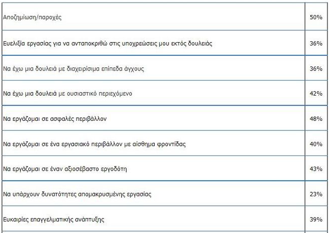 - το 35% των Ελλήνων ερωτηθέντων δήλωσε ότι προήχθη αλλά μόνο το 12% δηλώνει ότι έλαβε αύξηση μισθού. Το 14% δήλωσε ότι δεν έχει λάβει αύξηση μισθού, ούτε αναμένει να λάβει. Τον περασμένο χρόνο, η ικανότητα απόκτησης εισοδήματος βελτιώθηκε για το 12% των Ελλήνων εργαζομένων, εξαιτίας της αύξησης στη ζήτηση για δεξιότητες που διαθέτουν.