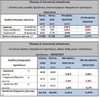 Οι φετινές ειδικές έκτακτες συνθήκες εορτασμού της πασχαλινής περιόδου, εξαιτίας του Κορωνοϊού – COVID 19 – και των εφαρμοζόμενων προστατευτικών για την υγεία των πολιτών περιοριστικών μέτρων, επηρέασαν ελάχιστα το κόστος του πασχαλινού τραπεζιού του τρέχοντος έτους σε σχέση με το αντίστοιχο περυσινό.