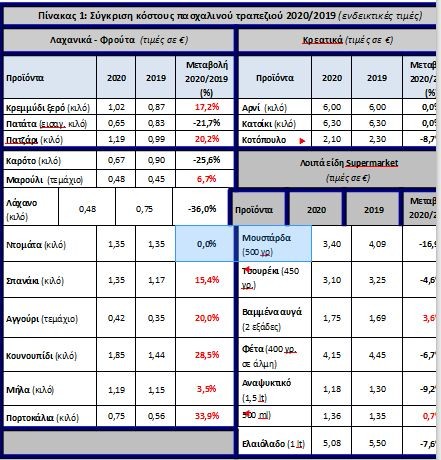 Πιο συγκεκριμένα και όπως προαναφέρθηκε, η αύξηση της τιμής/μονάδα προϊόντος των οπωροκηπευτικών (μεσοσταθμικά κατά +6,08%), υπεραντισταθμίστηκε από τις φθηνότερες-σε σχέση με το 2019- τιμές των προϊόντων Supermarket (μεσοσταθμικά κατά -5,2%). Με μία πρώτη ματιά φαίνεται ότι η ποσοστιαία μείωση των προϊόντων supermarket υπολείπεται της αντίστοιχης ανοδικής των Λαχανικών/Φρούτων κάτι που θα μπορούσε να ισοδυναμεί με αύξηση του κόστους, με δεδομένη και τη στασιμότητα των τιμών του Αρνιού και του Κατσικιού. Ωστόσο κάτι τέτοιο δε λαμβάνει χώρα.