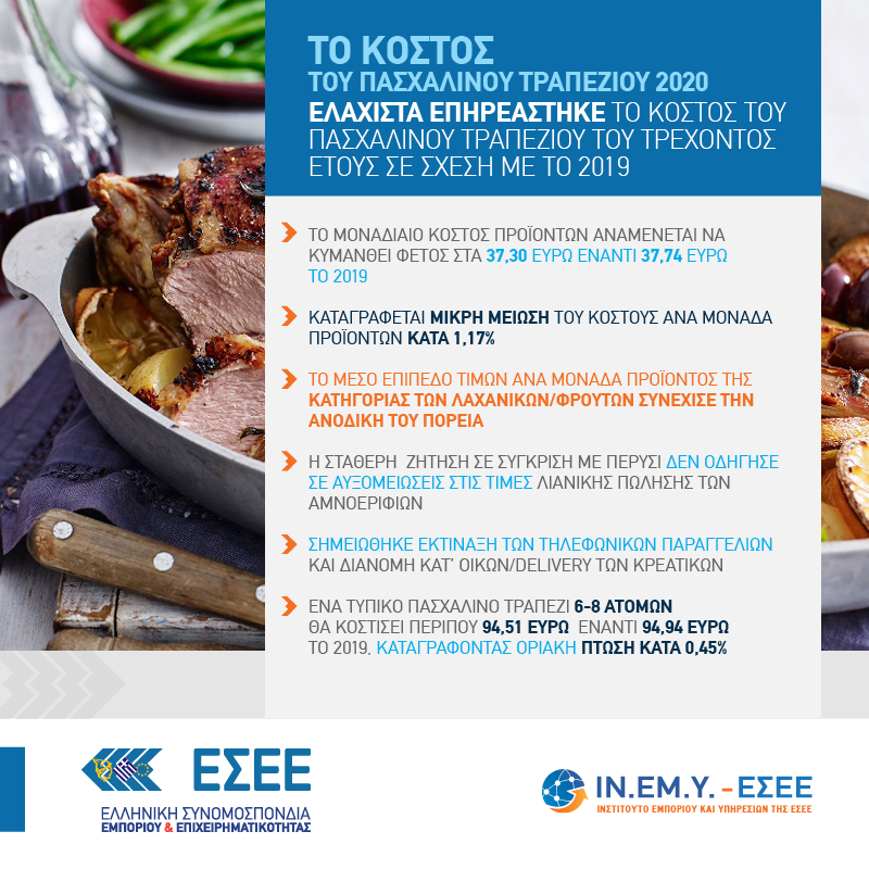 Σύμφωνα λοιπόν με μετρήσεις που διεξήγαγε το ΙΝ.ΕΜ.Υ. -ΕΣΕΕ την περίοδο 13-15/4/2020, το μοναδιαίο κόστος των προϊόντων που απαρτίζουν το καθιερωμένο πασχαλινό τραπέζι αναμένεται να κυμανθεί φέτος στα 37,30 ευρώ έναντι 37,74 ευρώ το 2019. Προκύπτει συνεπώς, μία μικρή μείωση του κόστους ανά μονάδα προϊόντων κατά 1,17% ή κατά 0,44 ευρώ, η οποία απορρέει κατά βάση από τα φθηνότερα προϊόντα που προμηθεύεται το καταναλωτικό κοινό από τα Supermarkets.