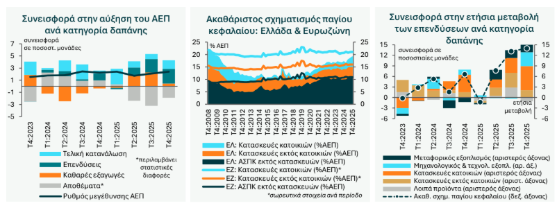 Οι επενδύσεις σε σχηματισμό παγίου κεφαλαίου αποτέλεσαν το βασικό πυλώνα της ανάπτυξης, επιταχυνόμενες στο 14,0% ετησίως το 4ο τρίμηνο, από 13,2% το 3ο τρίμηνο, με συνεισφορά 2,4 ποσοστιαίων μονάδων στην αύξηση του ΑΕΠ. Η ισχυρή δυναμική των επενδύσεων κατά το 4ο τρίμηνο τροφοδοτήθηκε τόσο από την επιταχυνόμενη των κατασκευών (οικιστικές κατασκευές: +41,2% και λοιπές κατασκευές: +8,5% ετησίως), αλλά και από την αύξηση των επενδύσεων σε μεταφορικό εξοπλισμό, λοιπά μηχανήματα, οπλικά συστήματα και προϊόντα δικαιωμάτων πνευματικής ιδιοκτησίας. Η συνεχιζόμενη ανάκαμψη της οικιστικής κατασκευαστικής δραστηριότητας είναι κομβικής σημασίας προκειμένου να αμβλυνθεί η στενότητα προσφοράς που επιτείνει το στεγαστικό πρόβλημα. Η ετήσια αύξηση των συνολικών επενδύσεων επιταχύνθηκε στο 8,4% το 2025 από 4,1% το 2024.