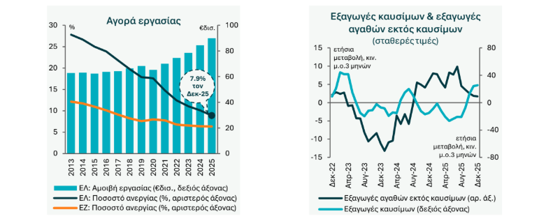 Οι εξαγωγικές επιδόσεις της χώρας, ειδικά όσον αφορά τα αγαθά, αποτέλεσαν τη θετική έκπληξη για ένα ακόμη τρίμηνο και σε συνδυασμό με τη σχετικά ήπια αύξηση των εισαγωγών οδήγησαν σε θετική συνεισφορά των καθαρών εξαγωγών της τάξης των 0,5 ποσοστιαίων μονάδων στην ετήσια μεταβολή του ΑΕΠ το 4ο τρίμηνο. Οι εξαγωγές αγαθών σε σταθερές τιμές αυξήθηκαν κατά 7,1% ετησίως το 4ο τρίμηνο και κατά 3,0% το 2025 − ο ισχυρότερος ρυθμός της τελευταίας 3ετίας.
