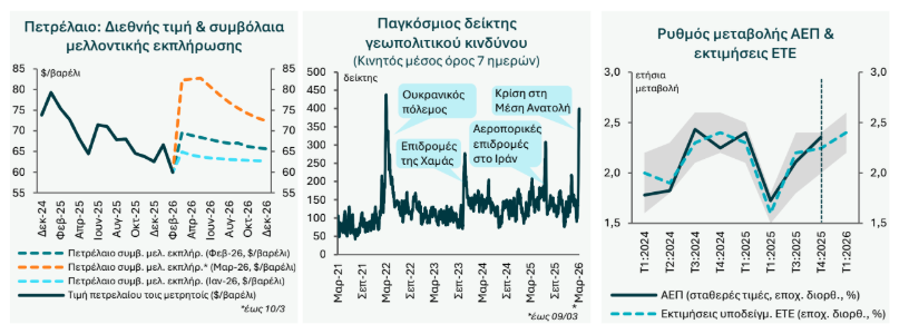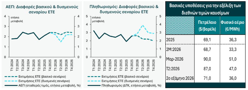 Υποθέτοντας, βάσει και των τελευταίων διαθέσιμων δεδομένων από τα αντίστοιχα συμβόλαια μελλοντικής εκπλήρωσης (futures) ότι οι τρέχουσες τιμές παγιώνονται στα τρέχοντα περίπου επίπεδα για το υπόλοιπο του Μαρτίου αλλά και τον Απρίλιο − με δεδομένο ότι φαίνεται εξαιρετικά δύσκολο να ομαλοποιηθεί άμεσα η διακίνηση ενεργειακών φορτίων διά θαλάσσης, μέσω των στενών του Ορμούζ – η ετήσια μεταβολή του ΔΤΚ για τον Μάρτιο και τον Απρίλιο αναμένεται να κυμανθεί στο 3,5-4,0%. Στο συγκεκριμένο σενάριο, ο πληθωρισμός υποχωρεί στο 2,9% κατά το 2ο εξάμηνο του 2026, όταν η τιμή του αργού πετρελαίου προβλέπεται ότι θα αποκλιμακωθεί στα 71 $/βαρέλι και η τιμή του φυσικού αερίου στα 36 €/Μwh, από 87$/βαρέλι και 47 €/Μwh, αντίστοιχα, στο 2ο τρίμηνο του 2026.