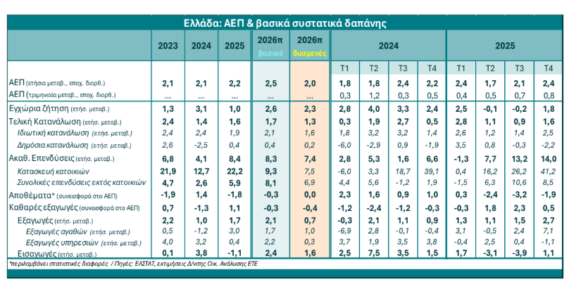 Η ελληνική οικονομία ολοκλήρωσε το 2025 με αυξημένη δυναμική, η οποία αποτυπώνεται τόσο στην ισχυρότερη αύξηση του ΑΕΠ σε ετήσια (+2,4%), όσο και σε τριμηνιαία (+0,8%) βάση το 4ο τρίμηνο (από 2,1% και 0,5% ετησίως αντίστοιχα το 9μηνο του 2025), καθώς και στην συγχρονισμένη ενίσχυση όλων των βασικών συνιστωσών της εγχώριας δαπάνης, που φανερώνουν ένα βελτιωμένο μείγμα ανάκαμψης, αναφέρει η Εθνική Τράπεζα σε ανάλυσή της.