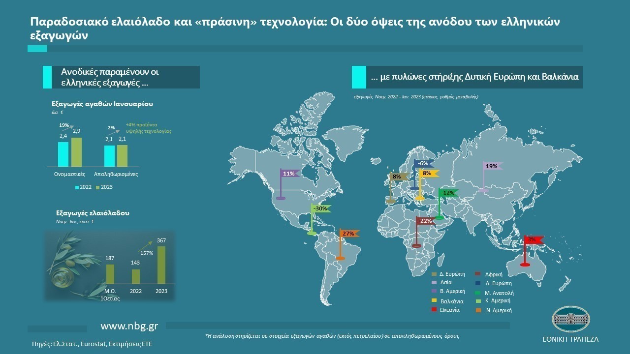 Στην ανάλυση αναδεικνύεται το πρωταγωνιστικό δίπολο της ανόδου: η συγκυριακή εκτόξευση του «παραδοσιακού» ελαιόλαδου και ο κομβικός ρόλος της «πράσινης» τεχνολογίας. Βασικό συμπέρασμα της ανάλυσης είναι ότι, παρά την επιβράδυνση του τελευταίου τριμήνου και το μειωμένο εύρος της βάσης ανόδου, η σταθερά ισχυρή επίδοση των εξαγωγών υψηλής τεχνολογίας θέτει στέρεες βάσεις για περαιτέρω κέρδη στις διεθνείς αγορές την επόμενη τριετία.
