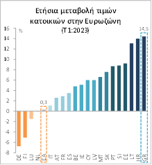 Η ανάκαμψη της ελληνικής αγοράς οικιστικών ακινήτων συνεχίζεται, με τη μέση τιμή κατοικιών να αυξάνεται κατά 14,5% ετησίως το 1ο τρίμηνο του 2023, που είναι ο ισχυρότερος ρυθμός εδώ και τουλάχιστον 30 χρόνια. Αυτή η επίδοση υπερβαίνει σημαντικά το μέσο όρο της Ευρωζώνης (+0,3% ετησίως το 1ο τρίμηνο του 2023). Η σωρευτική ανατίμηση των κατοικιών στην Ελλάδα από το χαμηλότερο σημείο κατά τη διάρκεια της ελληνικής κρίσης (3ο τρίμηνο 2017) ανέρχεται σχεδόν στο 50%, με το επίπεδό τους ωστόσο να παραμένει 14% χαμηλότερα από το ιστορικό υψηλό του 3ου τριμήνου του 2008, σε αντιδιαστολή με το μ.ο. της Ευρωζώνης που οι τιμές βρίσκονται 37% υψηλότερα από το 2008.