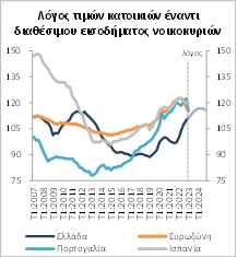-Παρά τη συσταλτική μεταβολή της νομισματικής πολιτικής από την ΕΚΤ από τα μέσα του 2022, οι συνθήκες δανεισμού εγχωρίως παρέμειναν υποστηρικτικές. Η απόκλιση των επιτοκίων των νέων στεγαστικών δανείων έναντι του μ.ο. της Ευρωζώνης συρρικνώθηκε το 2ο εξάμηνο του 2022 και το 1ο εξάμηνο του 2023, προσεγγίζοντας χαμηλό 7ετίας (0,35% τον Μάιο-Ιούνιο του 2023), λόγω της ανταγωνιστικής τιμολόγησης από τις ελληνικές τράπεζες.