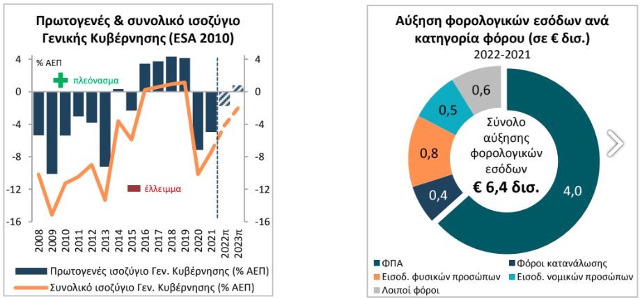 Τα έσοδα από τον ΦΠΑ αναμένεται να έχουν κομβική συνεισφορά – σημειώνοντας άνοδο 23,3% σε ετήσια βάση ή +€4,0 δισ. το 2022 – αντιπροσωπεύοντας περίπου τα 2/3 της ετήσιας αύξησης κατά €6,4 δισ. των συνολικών φορολογικών εσόδων το 2022. Παράλληλα, τα έσοδα από φόρους εισοδήματος φυσικών και νομικών προσώπων, αλλά και από ειδικούς φόρους κατανάλωσης υπερέβησαν κατά πολύ τους αρχικούς στόχους εν μέσω ραγδαίας αύξησης της ζήτησης και του κύκλου εργασιών των επιχειρήσεων.