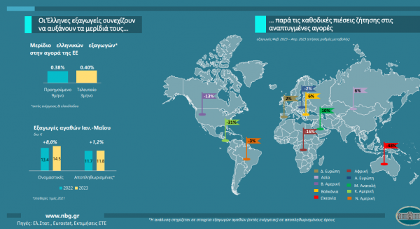 Συνεκτιμώντας όλα τα παραπάνω, οι ελληνικές εξαγωγές αναμένεται να προσεγγίσουν ρυθμούς ανόδου της τάξης του 2,5% το 2023 και να επιστρέψουν στη μεσοπρόθεσμη τάση του 5% το 2024, αυξάνοντας έτσι την εξωστρέφεια της χώρας και στηρίζοντας ενεργά την ανάπτυξη της ελληνικής οικονομίας.