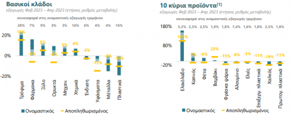 Αναλυτικότερα, οριακή άνοδο (+0,4%) σημείωσαν οι ελληνικές εξαγωγές αγαθών (εκτός ενέργειας) σε αποπληθωρισμένους όρους το τρίμηνο Φεβρουαρίου-Απριλίου 2023, ρίχνοντας ταχύτητα μετά από μια διετία αλματώδους ανάπτυξης (με μέσο ετήσιο ρυθμό της τάξης του 10%). Η επιβράδυνση ήταν αρκετά γενικευμένη, με την πλειοψηφία των κλάδων και των βασικών προορισμών να σημειώνουν αναιμικές επιδόσεις.