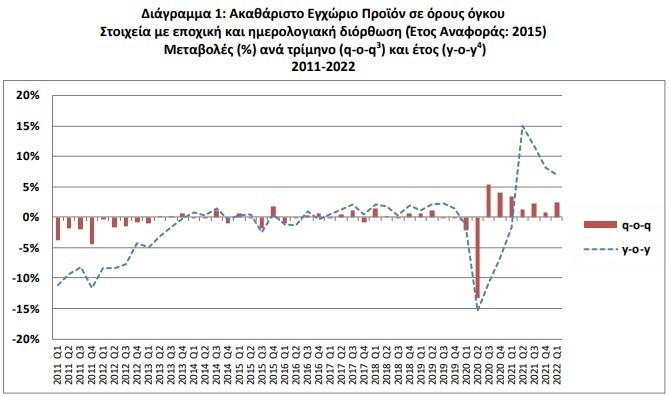 - Με βάση τα μη εποχικά διορθωμένα στοιχεία, το ΑΕΠ σε όρους όγκου, εμφάνισε άνοδο κατά 7,9% σε σχέση με το α’ τρίμηνο του 2021.
