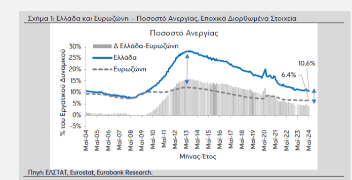 Όπως παρουσιάζεται στο Σχήμα 1, η μεγάλη απόκλιση σε όρους ποσοστού ανεργίας ανάμεσα στην ελληνική οικονομία και τους μέσους όρους της ΕΕ-27 και της Ευρωζώνης μειώθηκε σημαντικά τα 10 τελευταία χρόνια, εντούτοις, εξακολουθεί να είναι υψηλή αναδεικνύοντας την ύπαρξη δομικών προβλημάτων στην ελληνική αγορά εργασίας (π.χ. αναντιστοιχίες ανάμεσα στη ζήτηση εργασίας εκ μέρους των επιχειρήσεων και την προσφορά εργασίας εκ μέρους των νοικοκυριών).