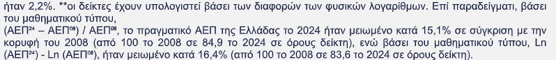 Εντούτοις, βάσει των στοιχείων του 2024, το πραγματικό Ακαθάριστο Εγχώριο Προϊόν (ΑΕΠ) στην Ελλάδα υπολείπεται κατά 15,1% σε σύγκριση με την κορυφή του 2008 (16,4% βάσει της διαφοράς των φυσικών λογαρίθμων, βλ. Διάγραμμα 1.2), ενώ σε κατά κεφαλήν όρους και σε μονάδες αγοραστικής δύναμης, βρίσκεται στο 70% του μέσου όρου της Ευρωπαϊκής Ένωσης των 27 κρατών μελών και στο 67,3% του μέσου όρου της Ευρωζώνης. Επιπρόσθετα, ο πληθωρισμός, μετά την αποκλιμάκωσή του από τα υψηλά 30ετίας του Σεπ-22 αποδεικνύεται επίμονος, λόγω της συνιστώσας των υπηρεσιών, και το έλλειμμα του ισοζυγίου τρεχουσών συναλλαγών παραμένει υψηλό, στοιχεία που μαρτυρούν την ύπαρξη διαρθρωτικών αδυναμιών της ελληνικής οικονομίας. Τούτων δοθέντων, η διατήρηση ικανοποιητικών ρυθμών μεγέθυνσης, στηριζόμενων στις επενδύσεις, τις εξαγωγές, τη δημοσιονομική πειθαρχία και τη διαρθρωτική ανταγωνιστικότητα, καθίσταται επιβεβλημένη έτσι ώστε: πρώτον, να καλυφθούν με βιώσιμο τρόπο οι απώλειες της πολυετούς κρίσης χρέους μέχρι τις αρχές της επόμενης δεκαετίας, και δεύτερον, να μειωθεί η απόκλιση της Ελλάδας από την ΕΕ-27 και την Ευρωζώνη σε όρους κατά κεφαλήν ΑΕΠ.