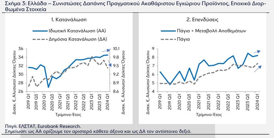 Σύμφωνα με την Eurobank, η ανθεκτικότητα της καταναλωτικής δαπάνης, η συνέχιση της αύξησης των επενδύσεων παγίων και η αντιστροφή της καθοδικής πορείας των εξαγωγών θα κρίνουν σε μεγάλο βαθμό το κατά πόσο η ελληνική οικονομία θα επαληθεύσει τις τρέχουσες προβλέψεις επίσημων οργανισμών που κατά μέσο όρο τοποθετούν την ανάπτυξη το 2024 λίγο πιο πάνω από το 2,0%.