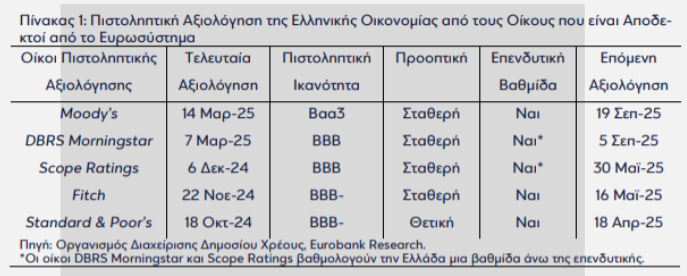 Τη θετική είδηση αναφορικά με την αναπτυξιακή πορεία της ελληνικής οικονομίας το 2024, διαδέχτηκε μια εβδομάδα αργότερα η ανακοίνωση του οίκου Moody’s, του αυστηρότερου οίκου από τους 3 «μεγάλους» (Moody’s, Standard & Poor’s και Fitch), για την πιστοληπτική αξιολόγηση της χώρας. Ο οίκος Moody’s αναβάθμισε την πιστοληπτική ικανότητα της Ελλάδας σε Baa3 (με σταθερή προοπτική), από Ba1 (με θετική προοπτική), κατατάσσοντάς την σε επενδυτική βαθμίδα για πρώτη φορά μετά από 14 χρόνια. Η εν λόγω αναβάθμιση αντανακλά την ενίσχυση της ανθεκτικότητας του πιστωτικού προφίλ της ελληνικής οικονομίας έναντι πιθανών μελλοντικών διαταραχών. Αξίζει να σημειωθεί ότι οι 5 οίκοι πιστοληπτικής αξιολόγησης (External Credit Assessment Institutions – ECAIs) που είναι αποδεκτοί από το ευρωσύστημα κατατάσσουν αυτή τη στιγμή το ελληνικό αξιόχρεο στην κατηγορία της επενδυτικής βαθμίδας (investment grade status, βλέπε Πίνακα 1). Αυτό το ποιοτικό χαρακτηριστικό ενισχύει την αξιοπιστία της ελληνικής οικονομίας, σε μια περίοδο που τα κύματα της αβεβαιότητας στη διεθνή οικονομική και γεωπολιτική σκηνή είναι συχνά και ενίοτε ισχυρά.