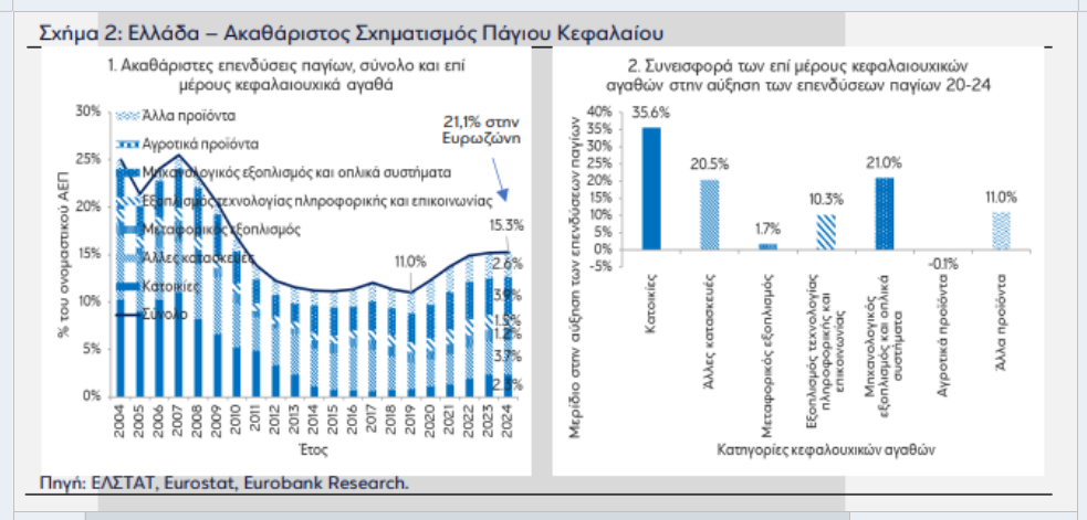 Τα 5 τελευταία χρόνια οι επενδύσεις παγίων στην Ελλάδα έχουν αυξηθεί κατά 4,3 ποσοστιαίες μονάδες του ΑΕΠ (το 35,6% αυτής της αύξησης προέρχεται από τις κατοικίες), ωστόσο το «επενδυτικό κενό» σε σύγκριση με την Ευρωζώνη εξακολουθεί να είναι υψηλό (-5,8 ποσοστιαίες μονάδες του ΑΕΠ, από -11,0 το 2019). Επιπρόσθετα, τη διετία 2023-2024 ο ρυθμός ανόδου του μεριδίου των επενδύσεων παγίων στο ΑΕΠ παρουσιάζει επιβράδυνση. Η επιτάχυνση των μεταρρυθμίσεων στην Ελλάδα δύναται να έχει σημαντικά οφέλη για την οικονομία στο μέλλον. Τα οφέλη δεν εστιάζονται μόνο στην αύξηση του δυνητικού ρυθμού μεγέθυνσης και των εισοδημάτων άλλα και στη θωράκιση της ελληνικής οικονομίας έναντι πιθανών μελλοντικών διεθνών κρίσεων, καταλήγει η έκθεση της Eurobank.