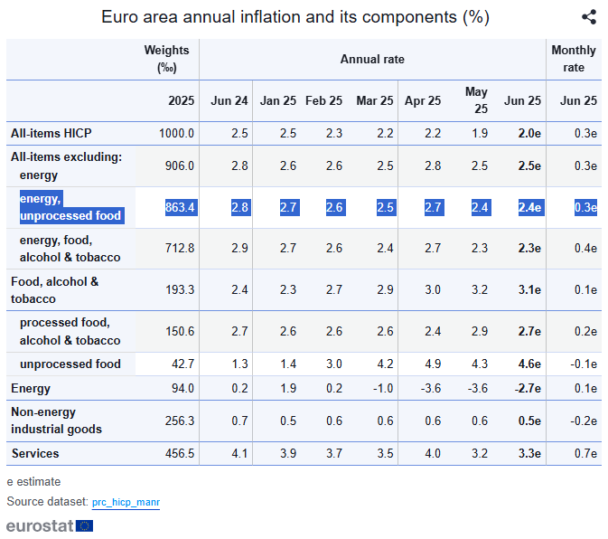 Στο 2% διαμορφώθηκε ο ετήσιος πληθωρισμός στην ευρωζώνη τον Ιούνιο του 2025, σύμφωνα με την πρώτη εκτίμηση (flash estimate) της Eurostat. Το ποσοστό αυτό παρουσιάζει ελαφρά άνοδο σε σχέση με το 1,9% που είχε καταγραφεί τον Μάιο.